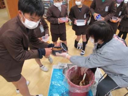 ちょうど一年前に作ったみそを開けて、みそ開きをしました!じっくりと時間をかけて発酵させたみそのいい香りがする中、一人ひとりが容器に入れてもらって持ち帰っています。残念ながら学校で味見をすることはできませんが、ご家庭でぜひ食べてみてください。