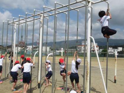 2年生、体育。上まで登れたね。