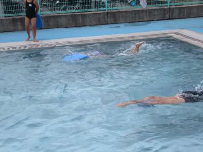 2年生は小プールで息継ぎしながらバタ足の距離を測定します。