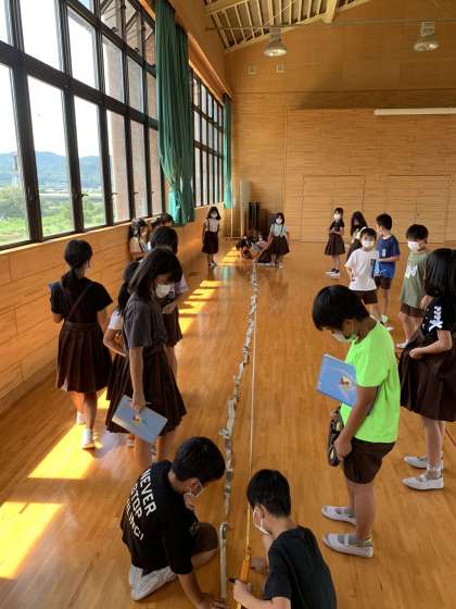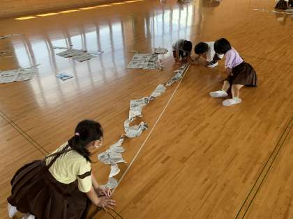 長さの勉強で、巻尺を使ってちぎった新聞紙の長さ比べをしました。1mより長いものを測るのには、巻尺を使うと便利だと気付きました。