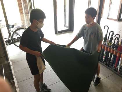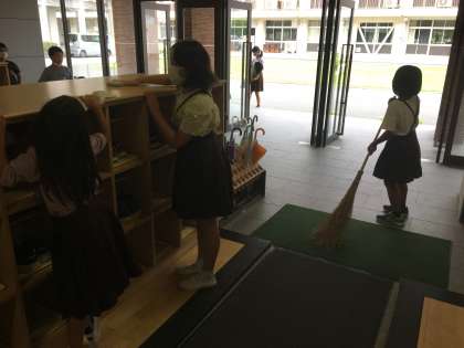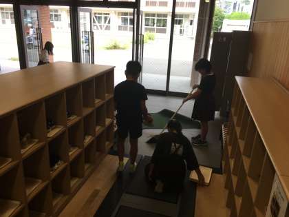 玄関掃除は広くて大変ですが、みんなで協力してできています。