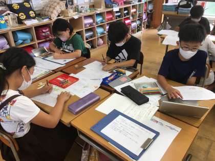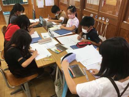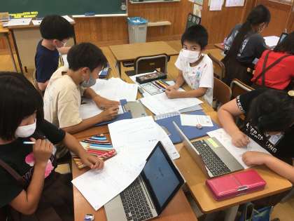 夏休みにおこなったエコチャレンジの成果をグループでまとめています。