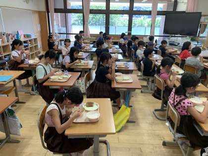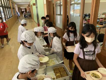 給食当番が協力をしてテキパキ配膳しています。給食中は静かに黙食できていますね。
