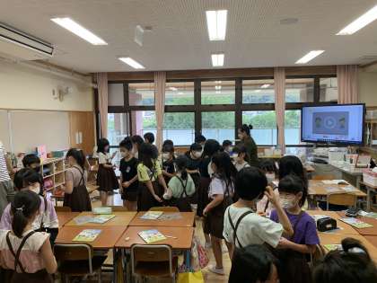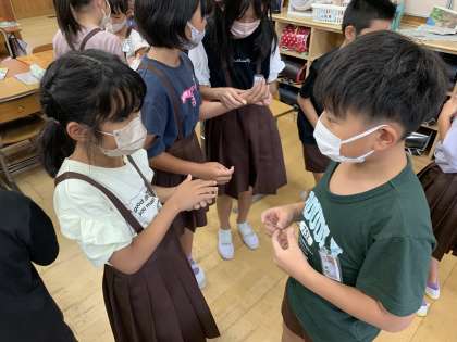 外国語活動の授業で友だちに好きな物を「What do you like?」と聞きました。同じ種類の好きなもの同士でグループも作りました。