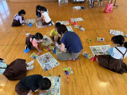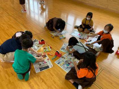 今回のふれあいルームは「チラシフリスビー」でした。マジックで絵をかいたり模様を描いたり絵に集中する子供たちもいてとても楽しそうでした。23名もの参加があり、「また遊びたいー」と喜んで帰りました。