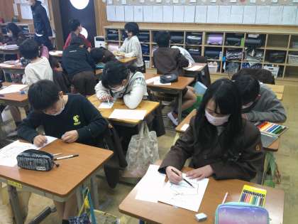 絵馬のイラストが描いてある紙に目標をしっかり書いて、色えんぴつで色を塗っていきます。みんなていねいな字でじっくり書きあげていました。