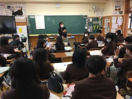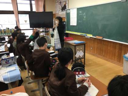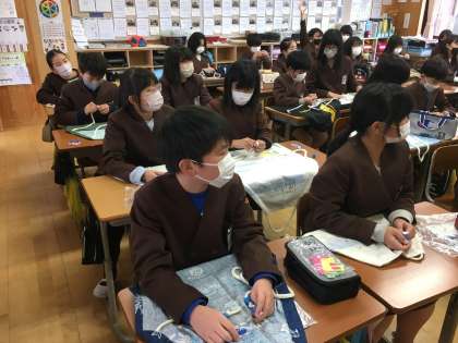 家庭科では最後の紐通しを終え、エプロンが完成しました。