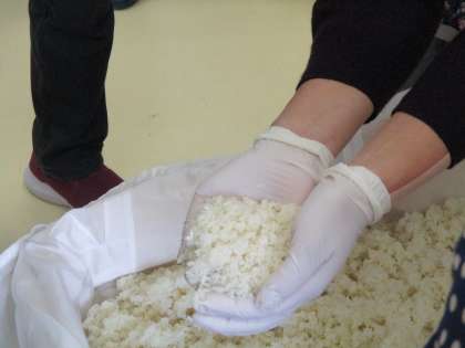 昨日は、米に種こうじをつけました。今日は、均一に発酵させるためのほぐす作業を見学しました。辺りは、ほのかに甘い香りがしていました。