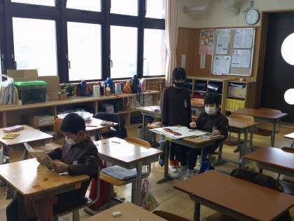 外は雪の影響で遊びに行けません。室内で出来る遊びをしたり、次の授業の準備をしたりとそれぞれの休憩時間を過ごしました。