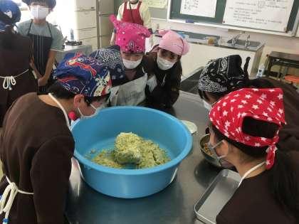 発酵しているお米の様子やにおいを観察したり、大豆をミンチにしたりして実習しました。