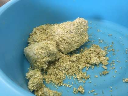 最後にこうじにつぶした大豆を混ぜて、ボール状に丸めて、桶にたたきつけました。