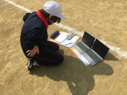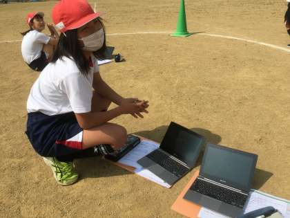 タブレットのデータや走り方の様子を見て、ペアの子がラップタイムを伝えたり、声掛けしてアドバイスを伝えたりします。
