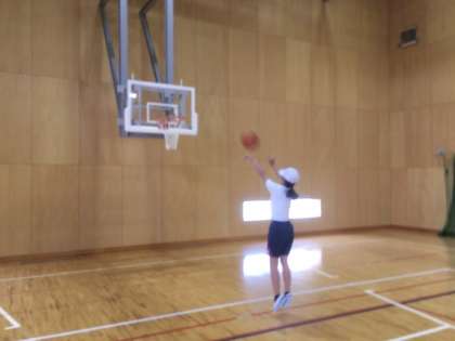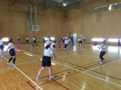体育科では、運動場がぬかるんでいたのでバスケットボールに取り組みました。