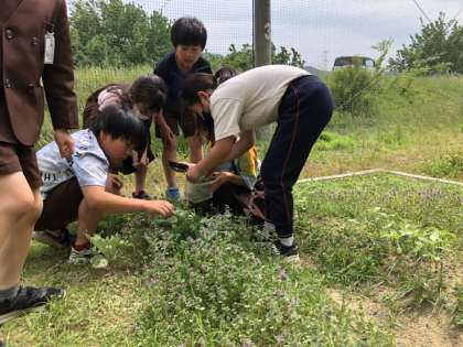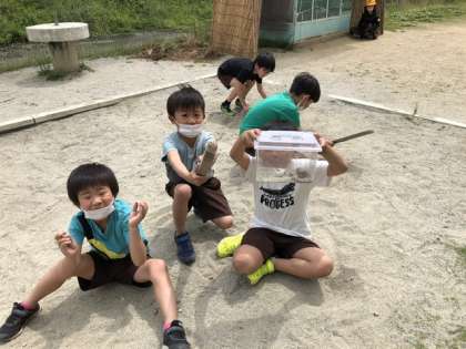 砂場で遊ぶ子、うーちゃんの観察をする子、青虫を捕まえる子、それぞれの時間を過ごしています。
