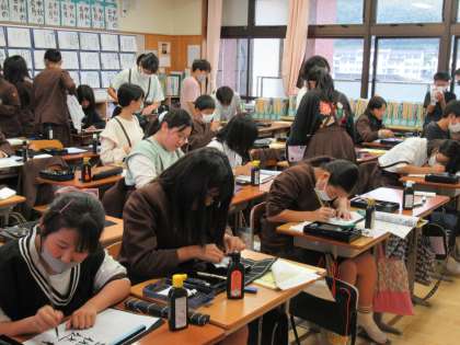 今回は「修学旅行」についての詩を筆でしたためていました。