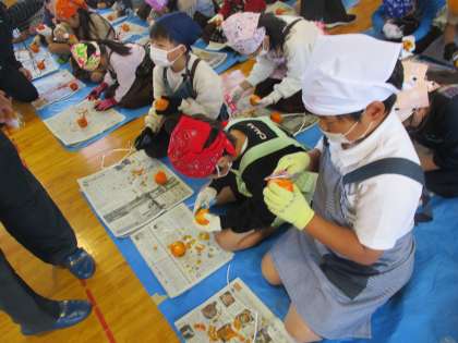 地域学習で、吊るし柿体験をしました!ピーラーで初めて皮むきをする子など全てが新しい経験になりました。今回の学習で私たちの地元が好きになりましたね!