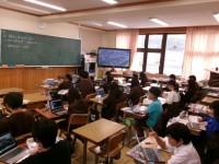 5月13日5年生B組は外国語です。電子黒板を使って授業を受けています。