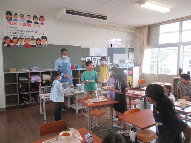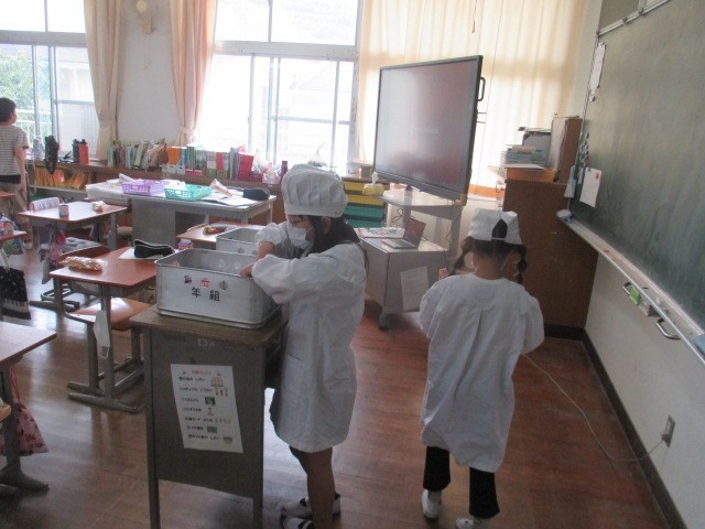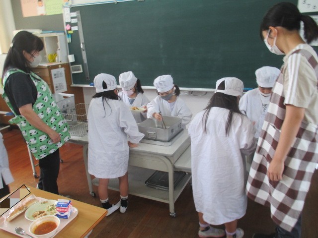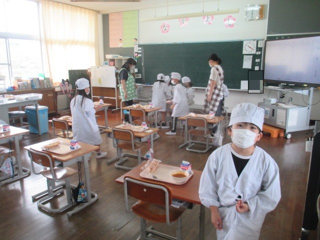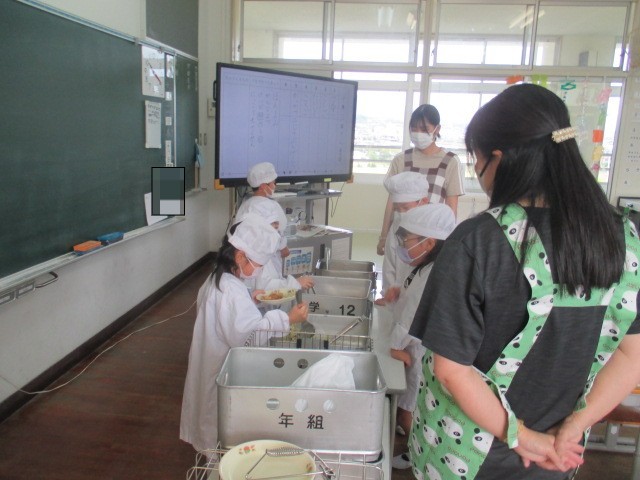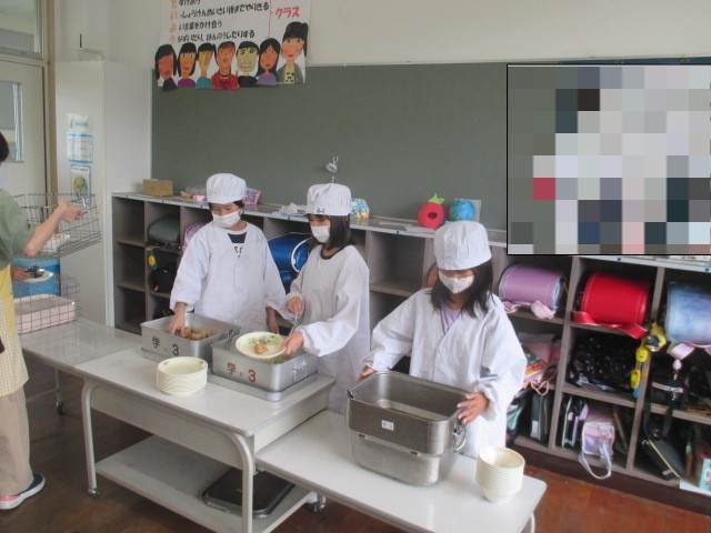 1・2・3年生の給食の配膳の様子です。1・2年生の撮影の後、3年生へ行くと鳥肉のレモンソースのじゃんけんをしていました。大人気メニューですね。