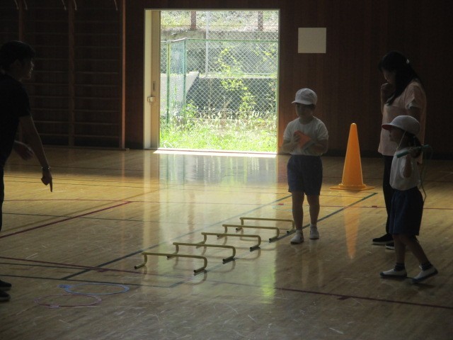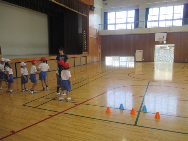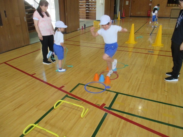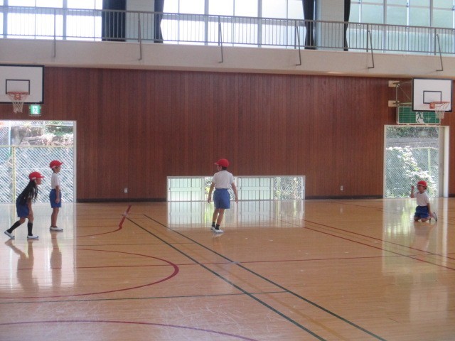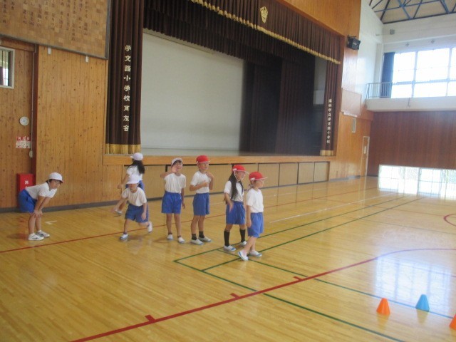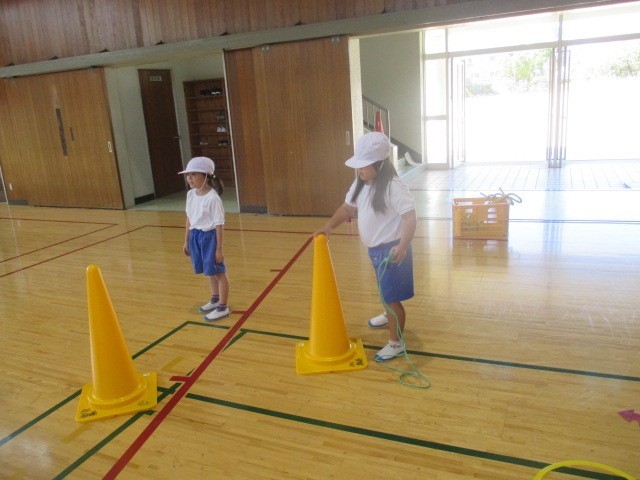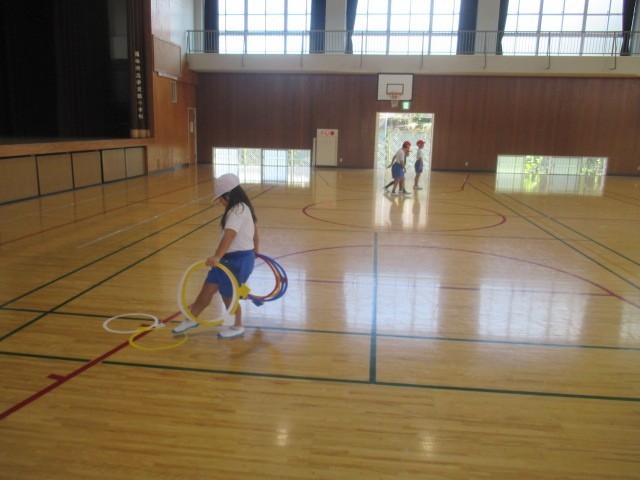 1・2年生の体育の様子です。輪っかとミニハードルを使って、体の全体を使った運動をしていました。ケンケンパッと輪っかを行きたい所ですが、子どもたちで輪っかやミニハードルを並び変えていました。