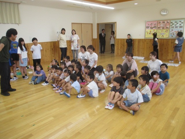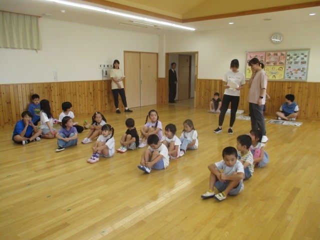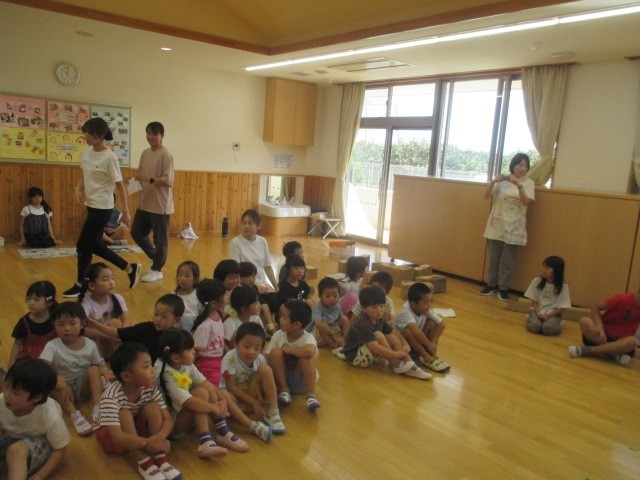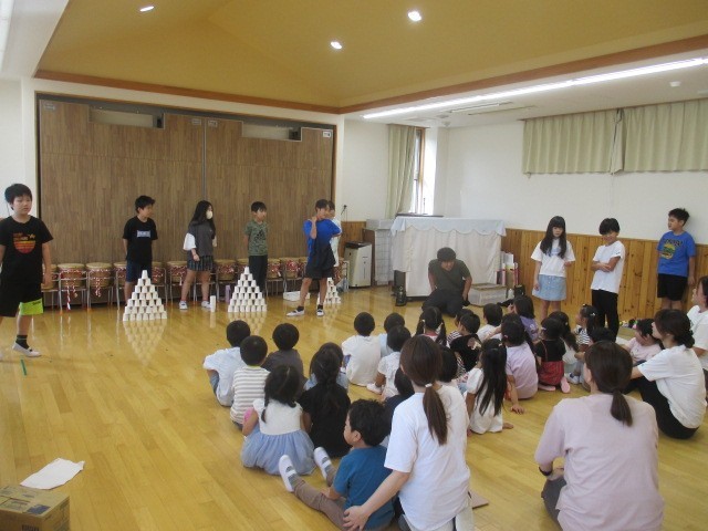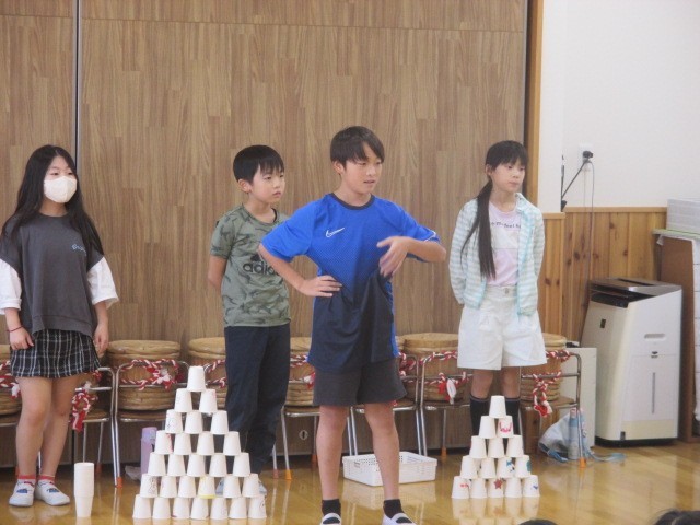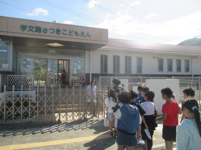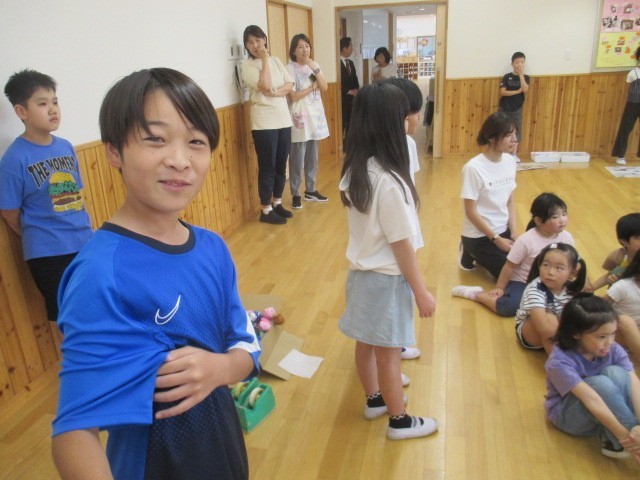 本日、4・5年生が学文路さつきこども園へ訪問に行きました。こども園では4つの出し物を園児が回っていきました。出し物は、紙コップタワー・宝探し・新聞紙じゃんけん・アイスクリームグループでした。園児たちもすごく喜んでくれていました。