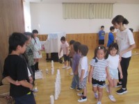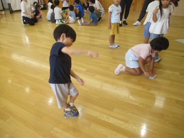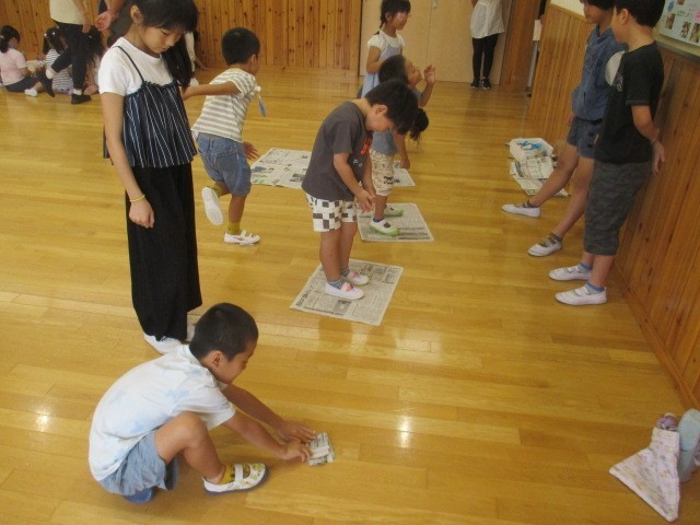 新聞紙じゃんけんは新聞紙の上に立ち、前で4・5年生がじゃんけんするので園児は負けたら新聞紙を半分に折って、また負けたら半分に折ってとどんどん小さくなって新聞紙の上にどこまで立てるかというゲームです。最初は大きい新聞紙でも、じゃんけんに負け続けるとあっという間に立てなくなってしまいますよ。最後にメダルのプレゼント大喜びでしたね。