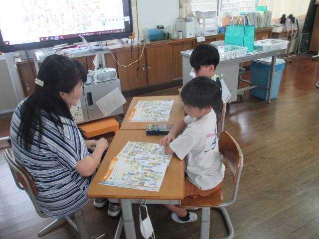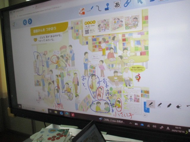 2年生の生活では、「図書館ではどんな工夫がされているのだろうか」をめあてに教科書を見ながら意見を出し合っていました。