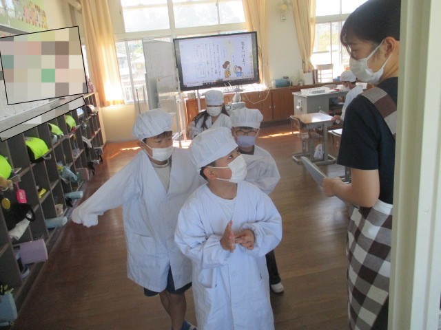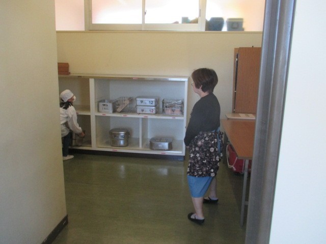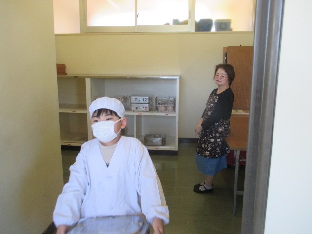 1・2年生の給食配膳の様子と給食ボランティアさんが配膳の手伝いをしてくれました。1・2年生は机や配膳台を吹いた後、みんな並んで食缶を取りに行っていました。