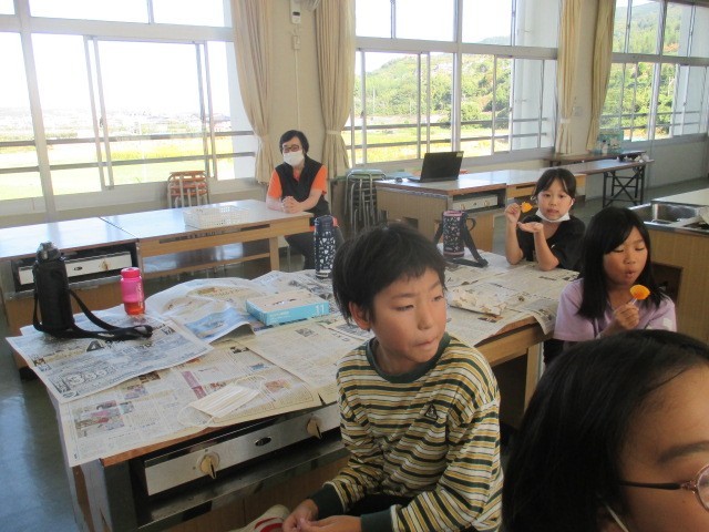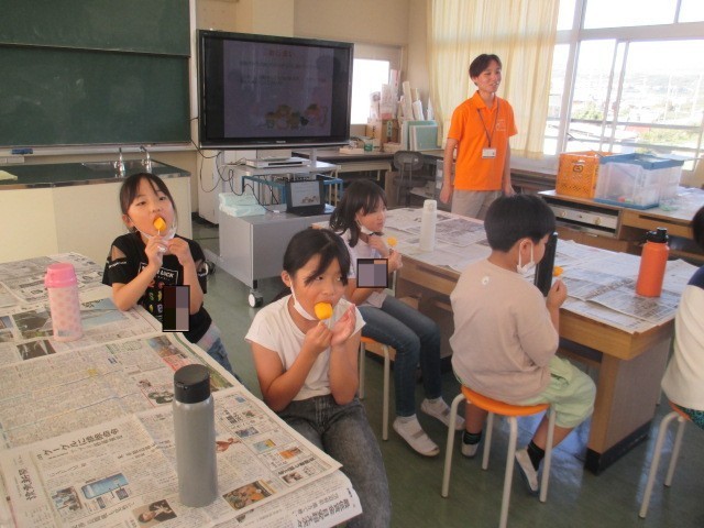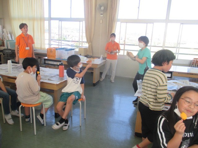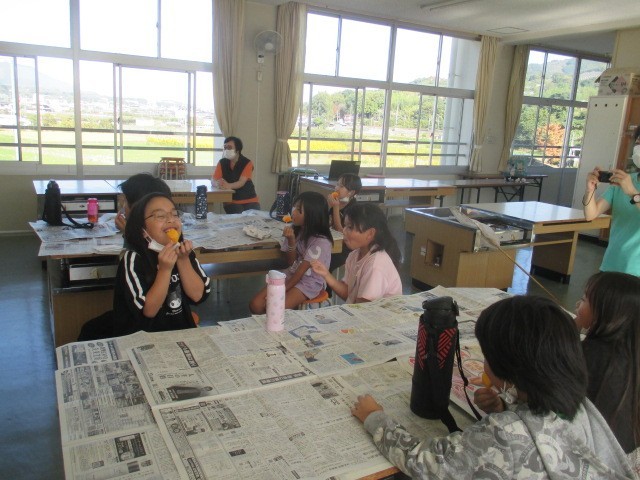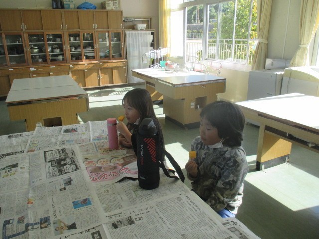 次は渋を抜いた柿を食べました。渋柿を食べた後だったので、「甘くておいしい♪」という声がたくさん出ました。「おかわりしたい人?」という声を聞くと行列ができました。