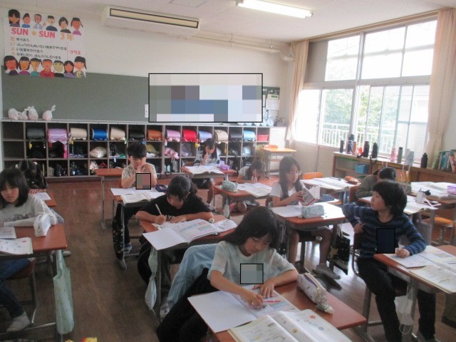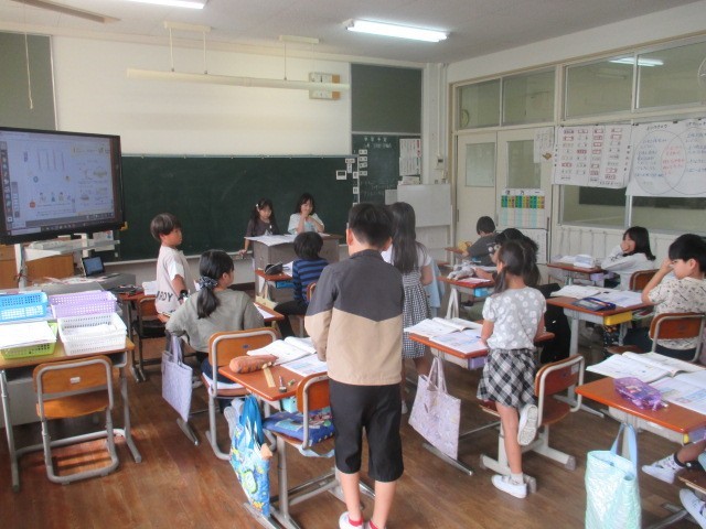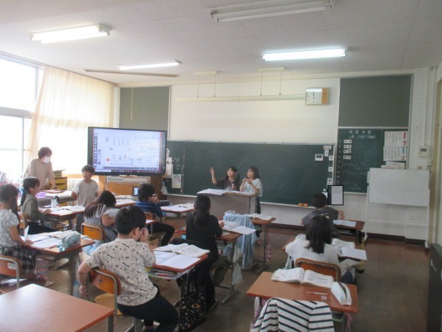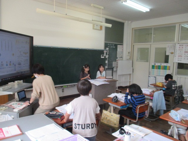 3年生の理科では、「日なたと日かげ」のまとめをしていました。学習係が前に出て答え合わせをしていました。