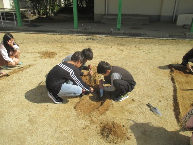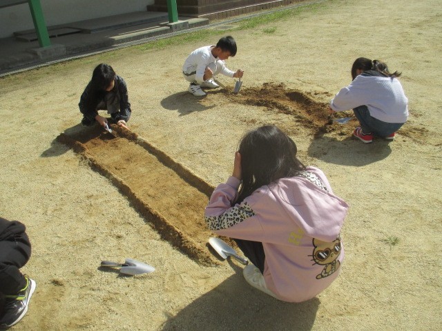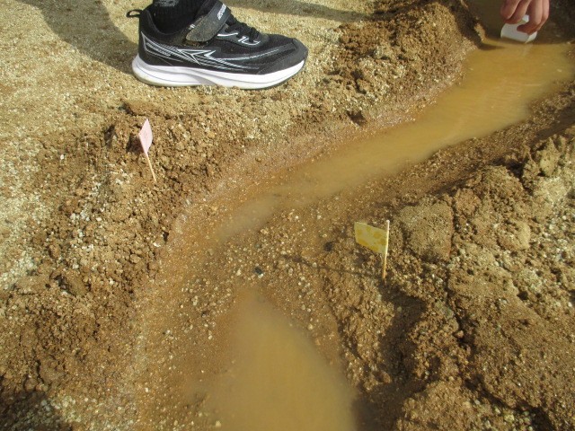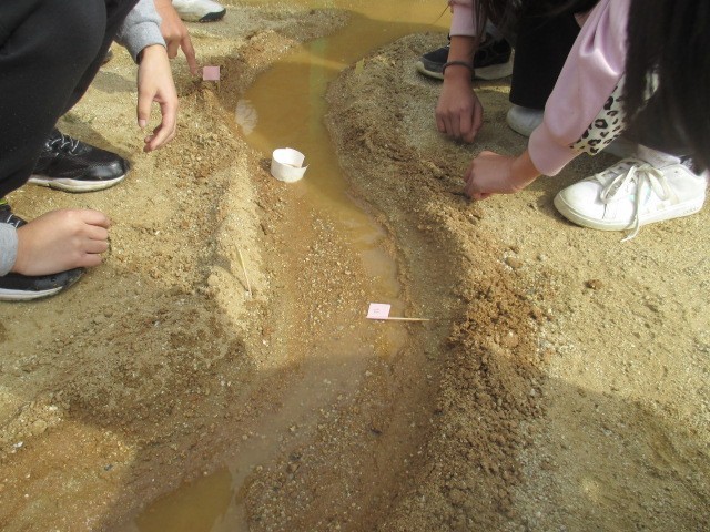 5年生の理科では、「流れる水のはたらき」の単元で運動場にS字・逆S字を作り水を流すと外側と内側の土がどうなるか、また幅が広いのと狭い直線を作った後、流す水の量を同じにし、どちらが早くゴールに流れるか2つの実験をしました。