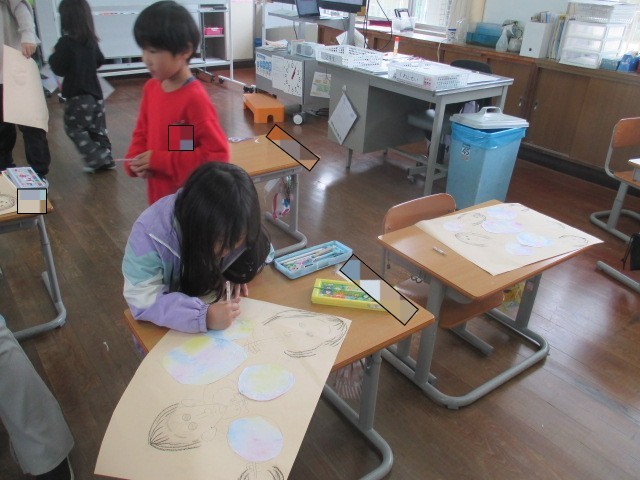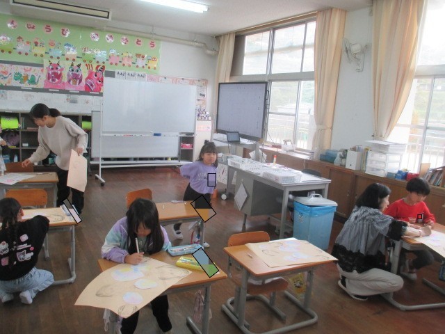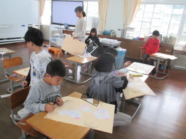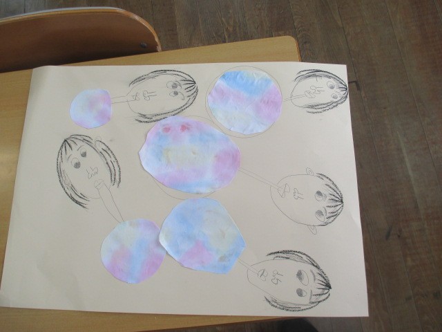 1・2年生の図工では、「シャボン玉をふいている絵」を描いていました。シャボン玉をふく表情がすごくいいですね。