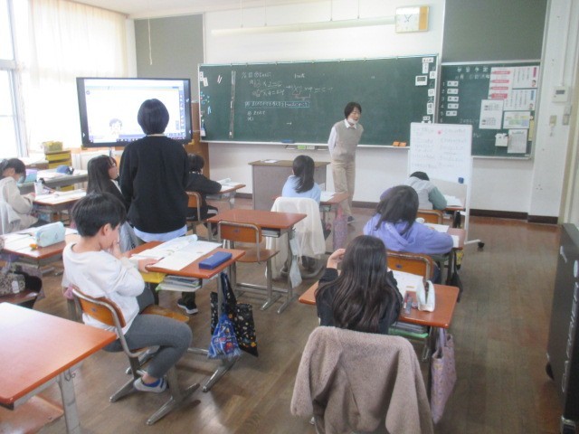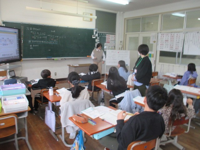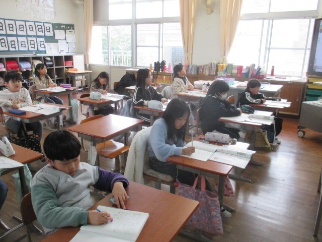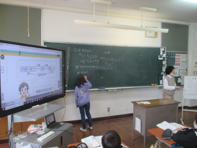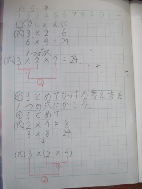 3年生は算数では「計算のじゅんじょ」の単元の授業でした。授業では2つの式を1つにするにはどうしたらいいか考えて発表していました。