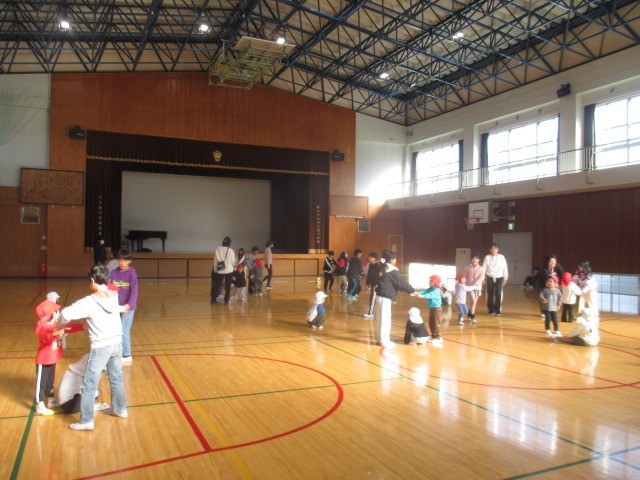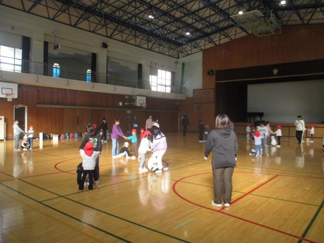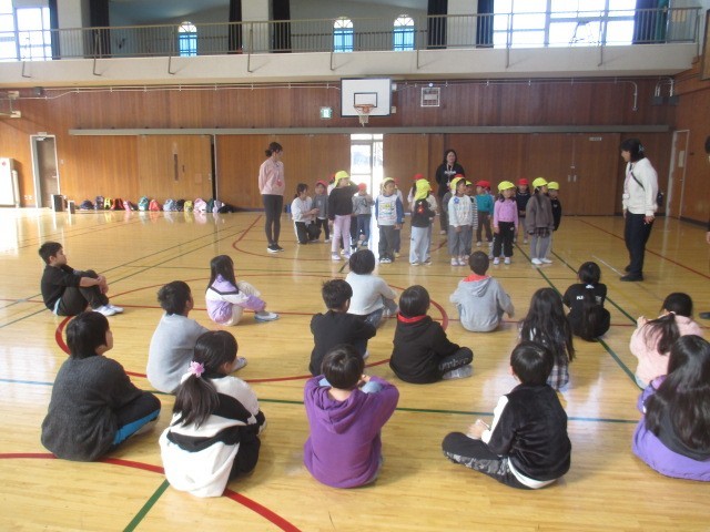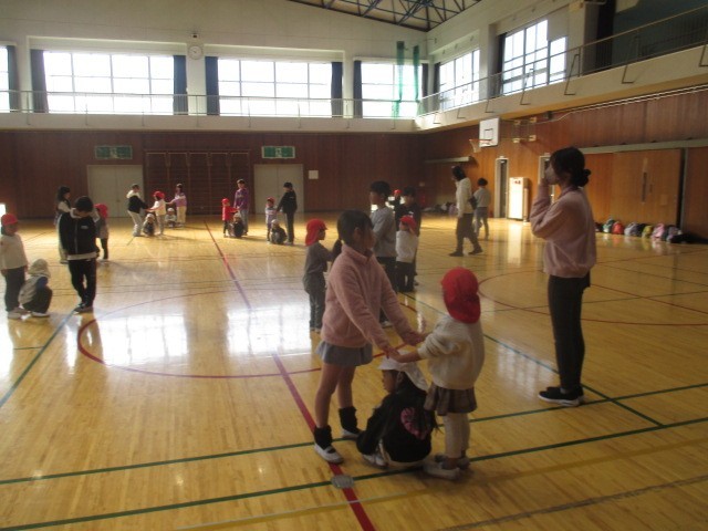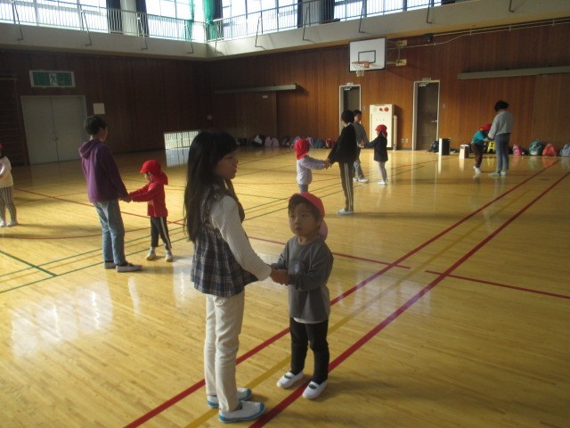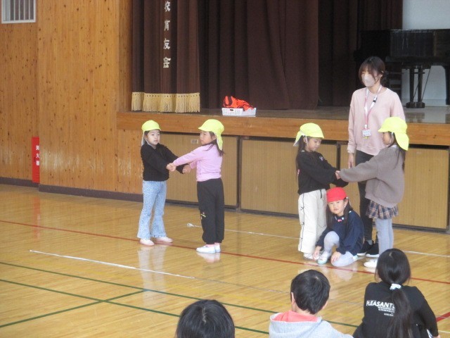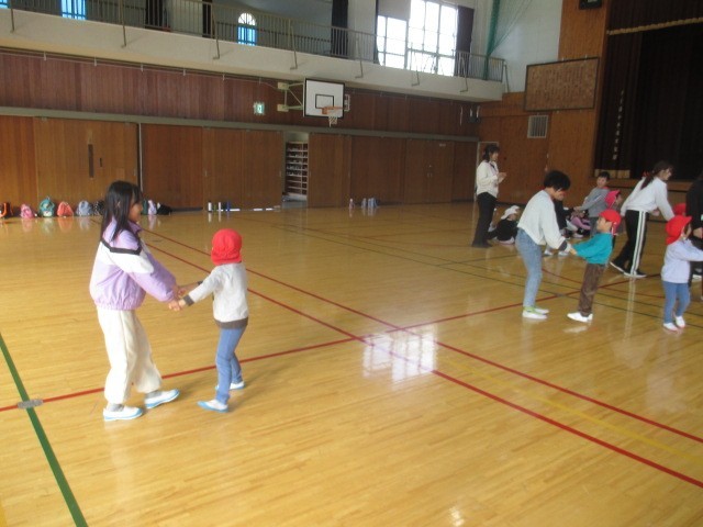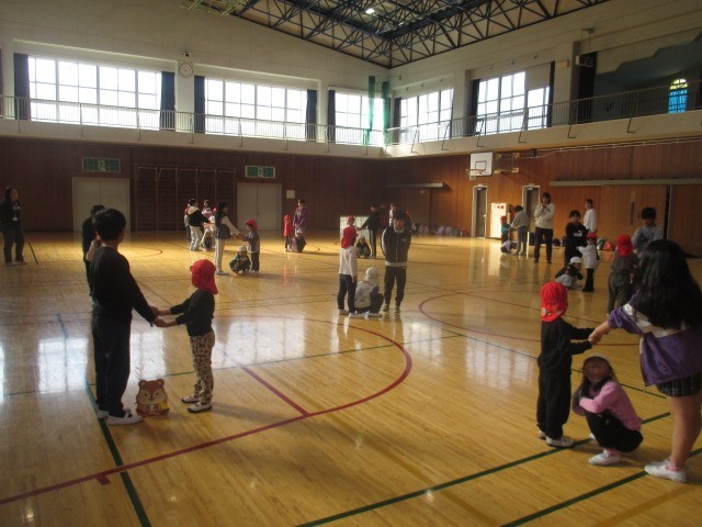 先週、雨で延期となっていた、4・5年生と学文路さつきこども園の園児との交流会がありました。最初は、「木とリス」という遊びをしました。「木とリス」は2人が手をつなぐと「木」、その中に1人入って「リス」になります。「木こりがきたぞ~」と」言う声で木の役はペアを変えて木になります。「オオカミが来たぞ~」でリス役が別の木に逃げます。「嵐がきたぞ~」で木の役は全員手をつなぎ大きな円を作ります。その中にリス役が逃げるという遊びです。園児と4・5年生が木の役になったり、リス役になったりして楽しみました。