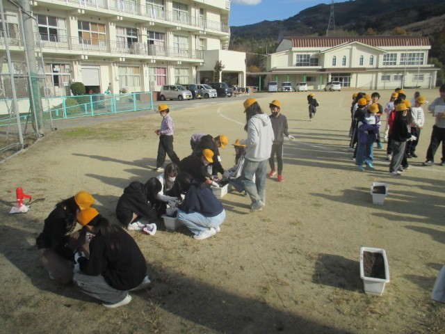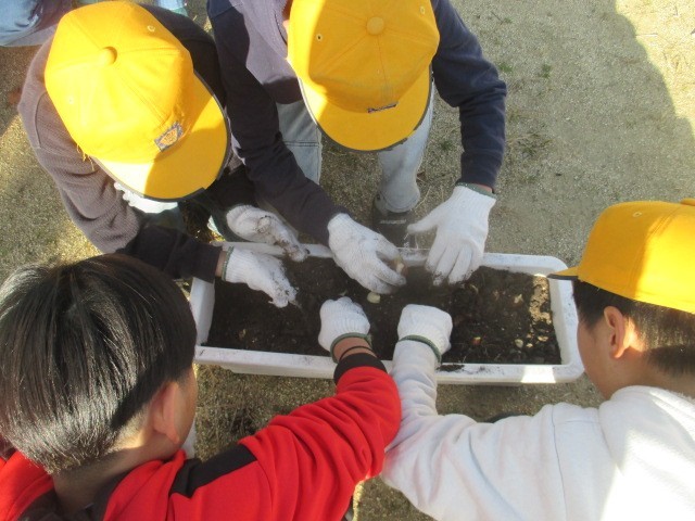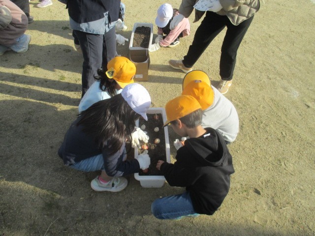 地域清掃の後、各学年でチューリップの球根をプランターへ植えました。