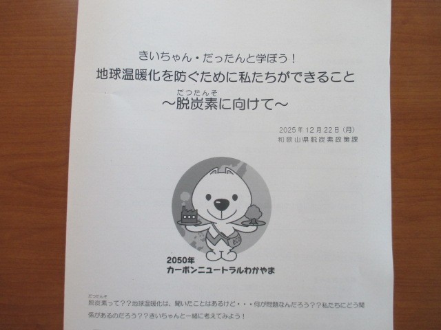 今日は、和歌山県環境生活部環境政策局脱炭素政策課脱炭素推進班の方に来ていただき、「地球温暖化を防ぐために私たちができること」について4・5年生が学習しました。