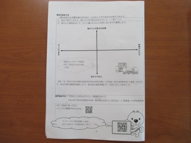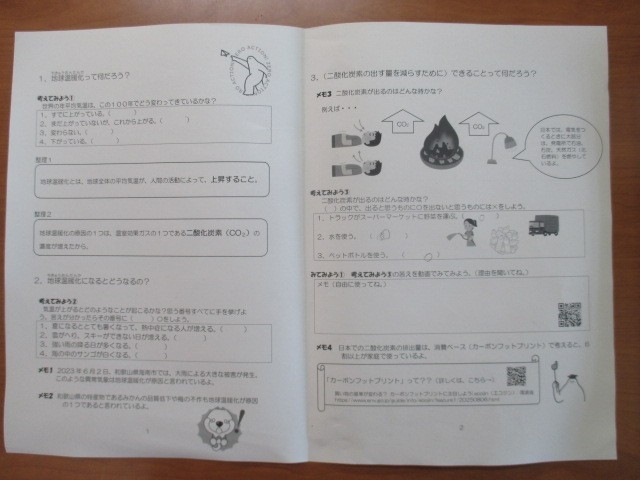 はじめに地球温暖化について学習した後、自分たちが地球温暖化を防ぐためには何ができるかを考えた後、グループで話し合い発表しました。