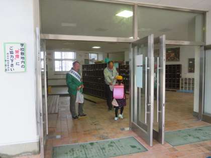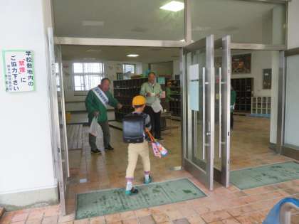 地域の人権啓発推進委員さんらと、元気にあいさつして、啓発グッズをいただきました。