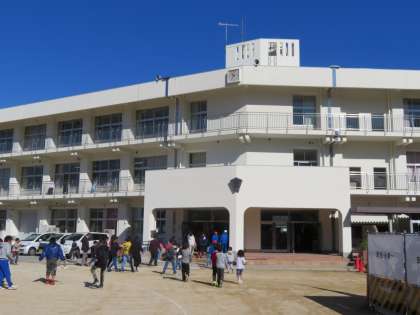 11月13日(月)、休みの間に、校舎塔屋部の足場もとれて、正面玄関部がくっきりと浮かび上がりました。