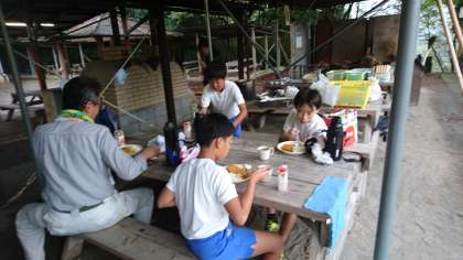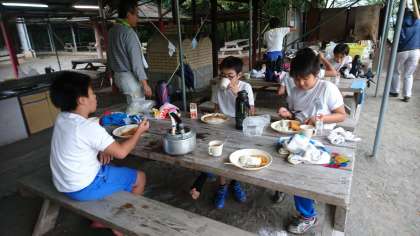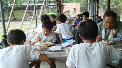 さあ、ゆうごはんです。みんなで協力して自分たちで作ったカレーのお味はどうでしょう。