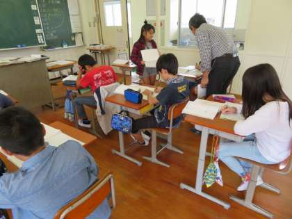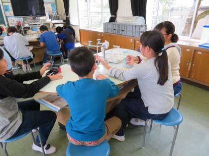(上)6年生、理科の時間。水溶液の実験のまとめ。塩酸と水酸化ナトリウム液の特徴をまとめていました。