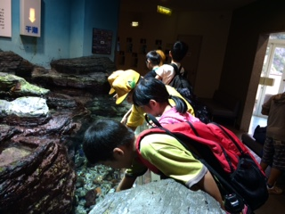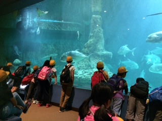 自然博物館の見学です。大きな水槽でたくさんの魚が泳いでいます。