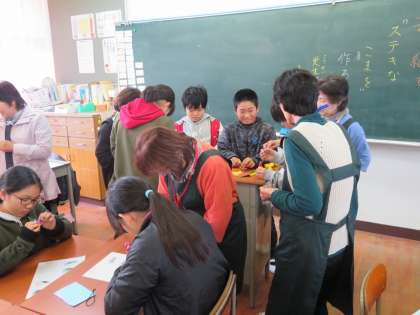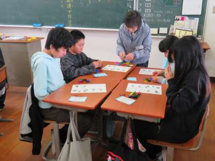 6年生は、小さな色紙を折り込んで、コマづくりに挑戦。複雑な折り方を教えてもらって、色鮮やかなカラーごまが完成しました。
