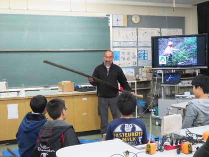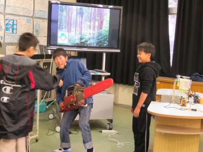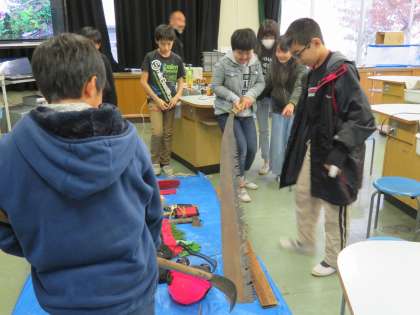 前半には、ゲストティーチャーの方に、森林についてのおはなしをいただき、実際に、森で使っている道具をさわらせてもらいました。