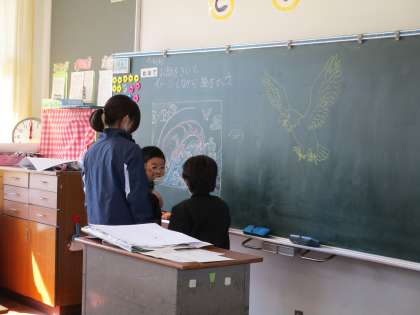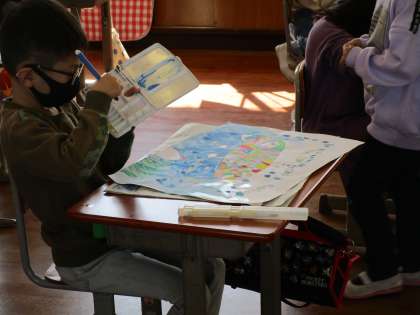2年生は図工の時間に、「お話をきいて、イメージしながら絵をかこう」というめあてで想像力をふくらませながら絵を描いていました。