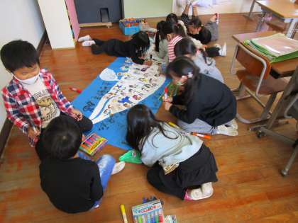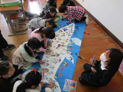 1年生がくじらぐもの絵を描いています。