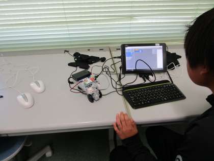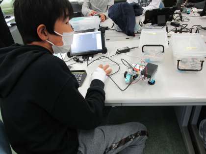 プログラムに入れる数字をいろいろ試しながらロボットを動かそうと集中しています。