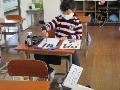 1時間目、4年生が2枚目の清書を行いました。練習をして集中力を高めてから一斉に書き始めました。