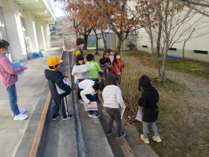 1年生は生活科の授業で、校内の草花や自然のものを探しました。すると、なんと今朝までの寒さで小プールが一面に凍っていました。