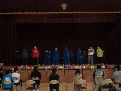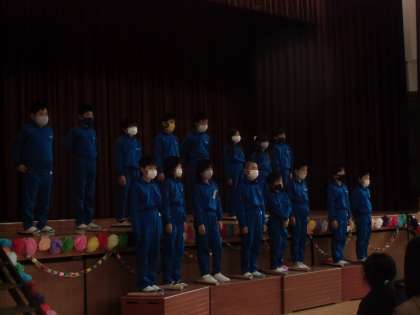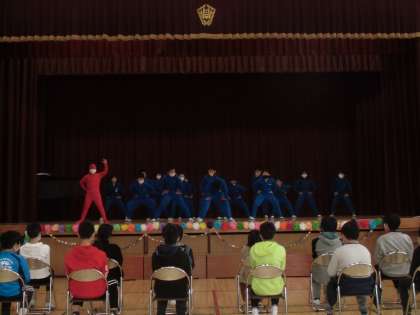 3年生の発表です。ラグビーの試合前に踊る「ハカ」で6年生を激励しました。赤の衣装の児童がリーダーとなりなんとも味わい深い、力強い発表です。3年生のご指名で6年生も壇上で踊りました。