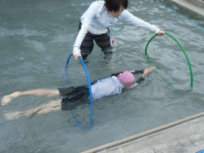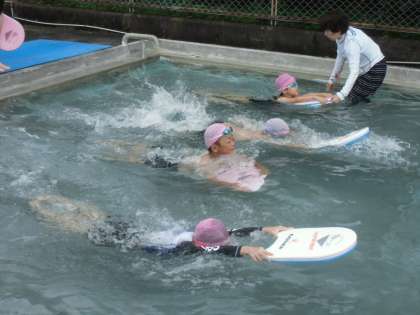 1年生は久しぶりのプール水泳です。児童は練習で水に慣れてくると顔を潜らせることに抵抗がなくなってきました。最後は先生を先頭に流れるプールをつくりました。